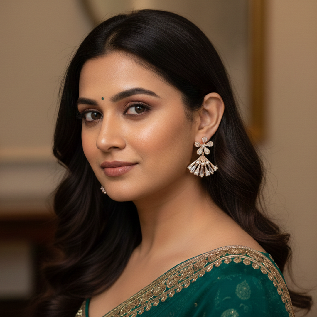Enhance your elegance with these exquisitely designed Rose Gold Floral Fan Drop Earrings. Featuring a delicate flower stud encrusted with shimmering stones and a graceful fan-shaped drop design, these earrings strike the perfect balance between sophistication and charm. The rose gold finish adds warmth and luxury, making them ideal for festive occasions, parties, weddings, and evening wear.