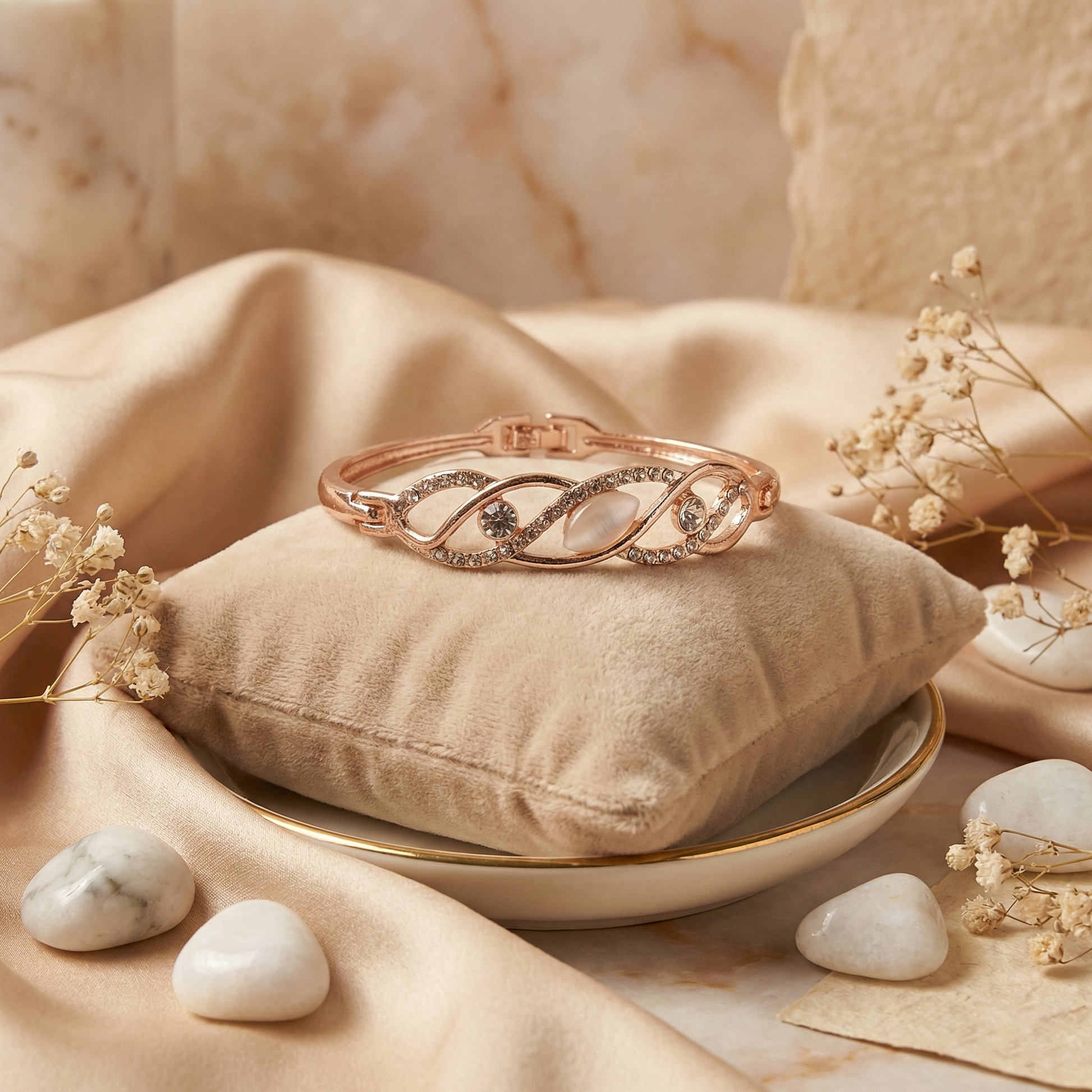 Graceful and contemporary, the Rose Gold Infinity Wave Cat’s Eye Crystal Bracelet is designed to symbolize elegance and continuity. The flowing wave-inspired pattern is beautifully highlighted with crystal accents and a soft cat’s eye centerpiece that reflects light with a subtle, glowing finish.